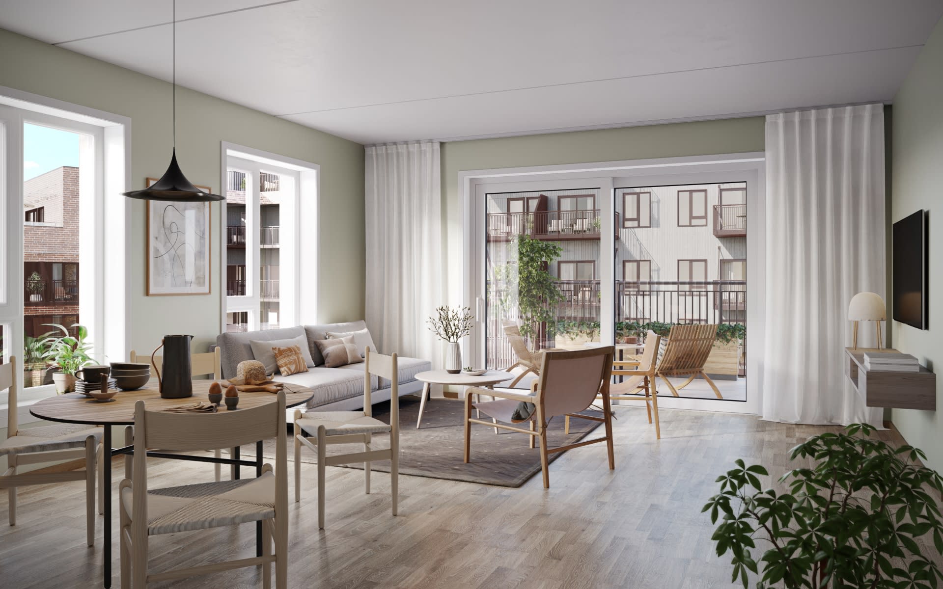 I en hektisk hverdag i stadig endring trakter vi mer og mer etter å omgi oss farger hentet fra naturen. Ved å kombinere ulike sjatteringer fra engene, skapes en beroligende fargepalett som gir perfekt lerret for øvrig innredning. Den lyse paletten gir rommene en behagelig estetikk og bevegelsen fra rom til rom vil gi opplevelsen av harmoni og ro. Konsept Naturlig Harmoni leveres som standard i prosjektet.